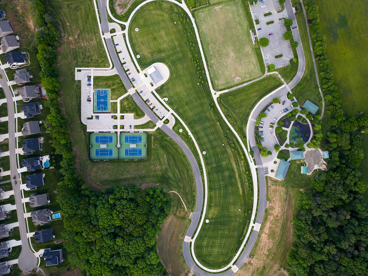 Phase 3 included mass grading of the entire site to accept future phases, the loop trail, utilities, a large event pavilion, tennis courts, basketball court, pervious paver parking lots, and the great lawn with event power